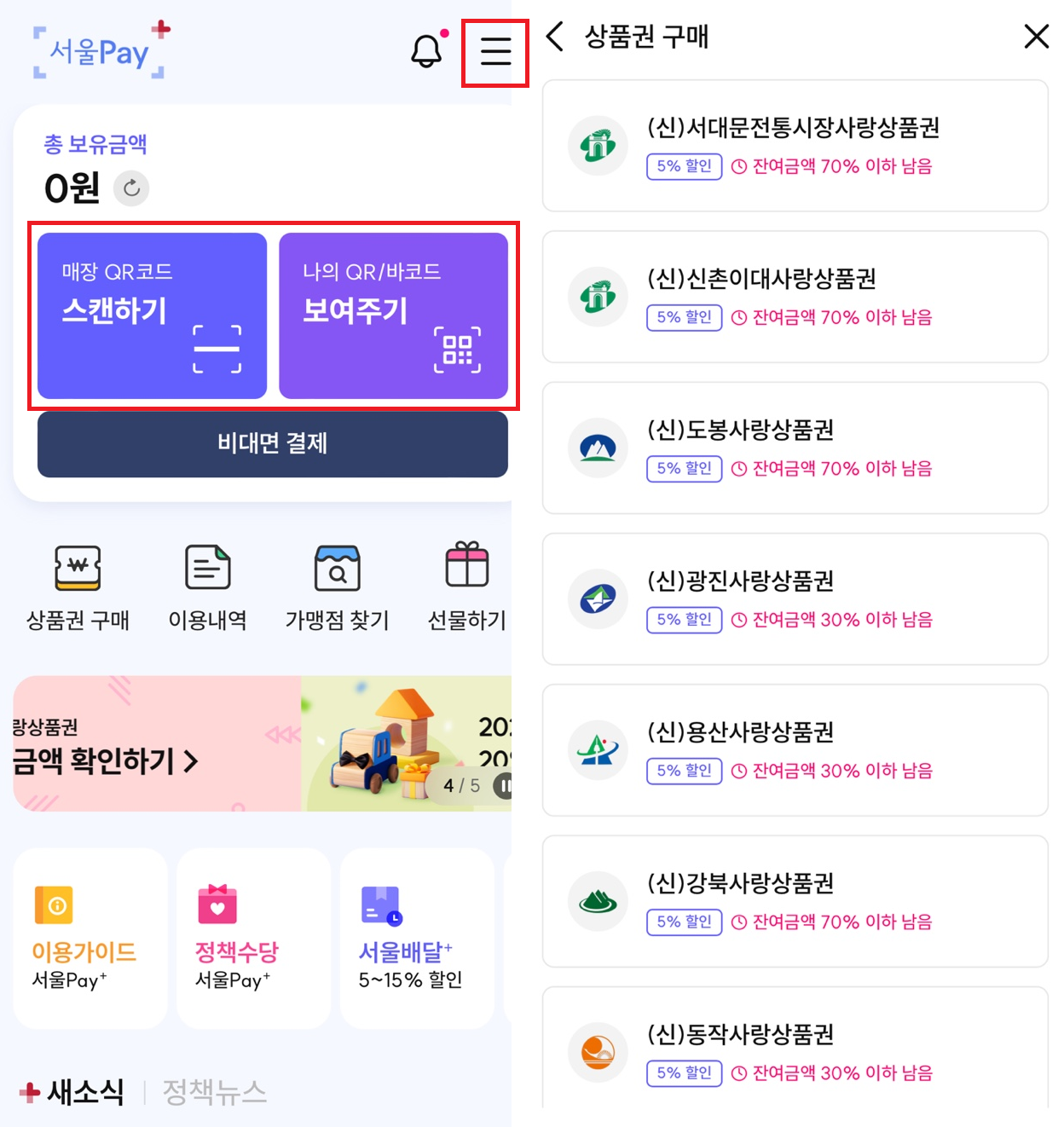 서울페이플러스앱에서 서울페이머니와 사랑상품권을 사용하거나 다양한 사랑상품권을 구매할 수 있습니다. 새롭게 출시된 서울페이플러스 어플을 사용하는 방법데 대해 포스팅하도록 하겠습니다.