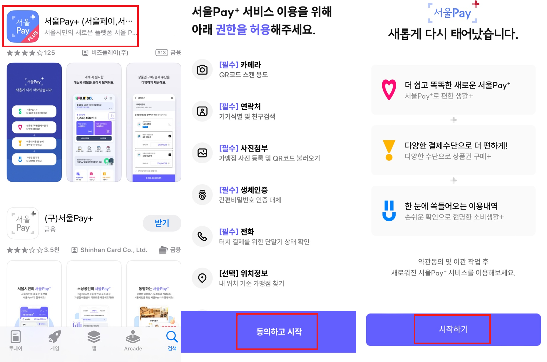 1. 서울Pay+ 어플을 다운받고, 권한을 허용하고 동의합니다. 시작하기를 눌러줍니다.