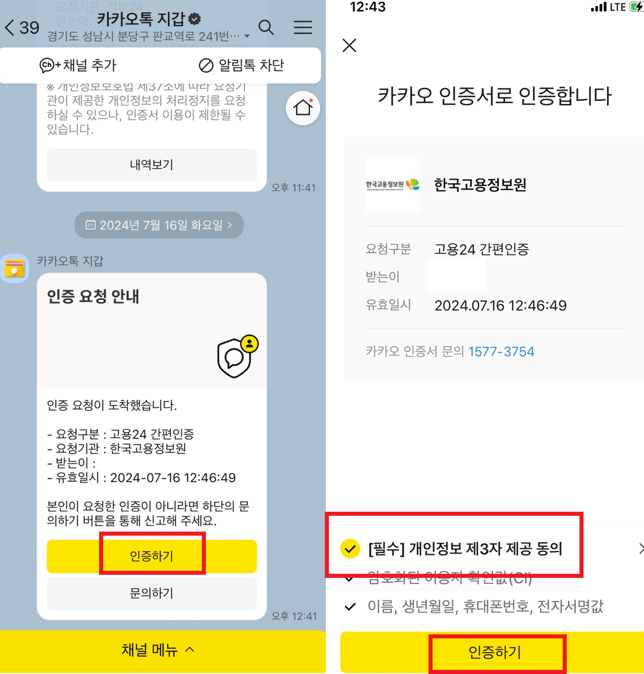 카카오톡을 클릭한 후 이름, 생년월일, 휴대폰 번호를 입력한 후 하단 인증요청을 클릭해주세요!