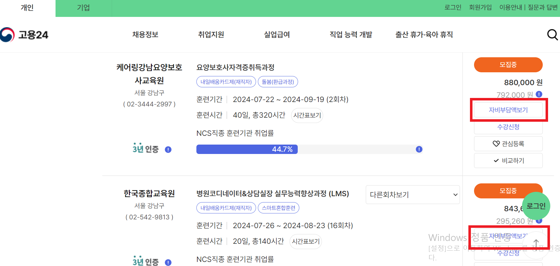 2. 요양보호사 교육원확인, 자부담비, 국비면제방법